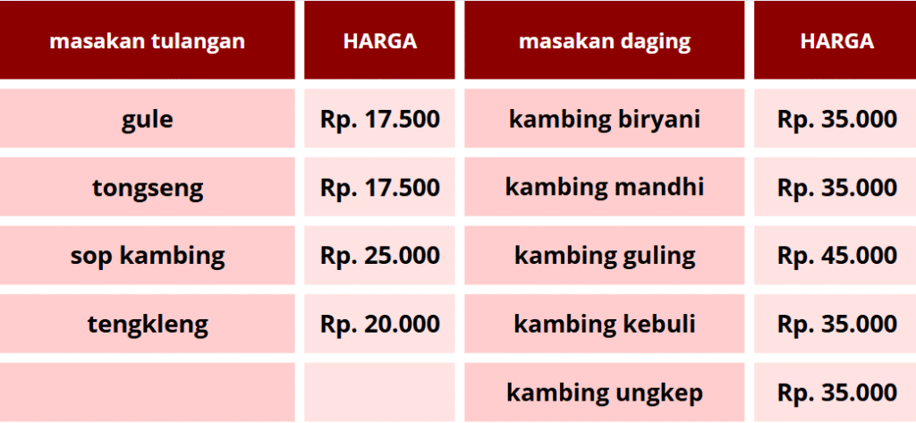 • untuk pesanan kambing guling ada tambahan masak Rp. 150.000/ekor