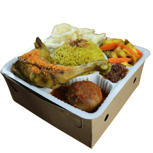 Nasi Kotak Nasi Kuning Enak, Praktis, Siap Antar Untuk Acara Kantor & Keluarga. Terdiri Dari nasi Kuning, Ayam Suwir, Ayam Paha, Ayam 1/4 / Nugget, Mie, Telor, Bergedel, Kering Tempe, Lalapan, Sambal